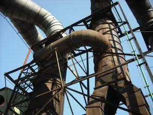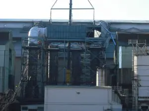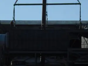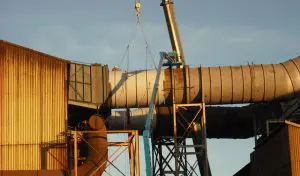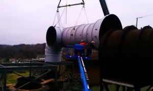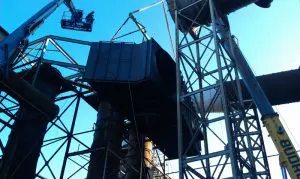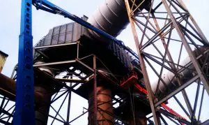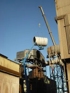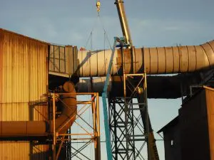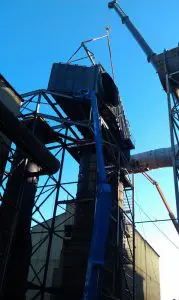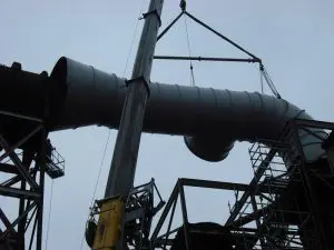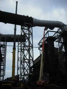Our work scope included demolition and replacement of large-bore ductwork, fan housings, expansion joints, and capture hoods above the furnace. Subcontractors were responsible for controls, structural steel fabrication, cleaning, and electrical services. The majority of the activities were conducted on elevated work areas 80’ – 120’ above grade. A 350-ton truck crane was carefully positioned between existing steel towers to allow all hoisting to be completed with crane relocation. One visitor asked “How did you get the crane in that position?” and the reply was “This is a job of inches.” The reply was appropriate for several instances during this project.